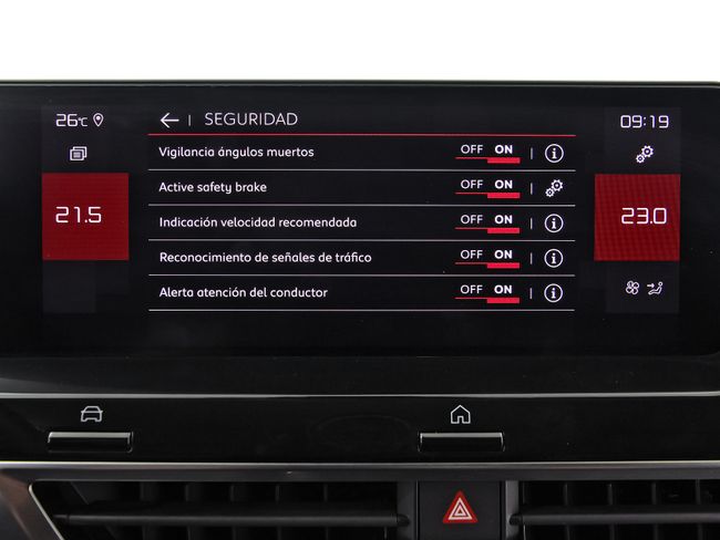- Sistema de alarma de colisión: activa las luces de freno con asistencia de frenado, sistema antiatropello peatones/ciclistas, monitorización del conductor y frenado a baja velocidad de 30 Km/h como mínimo aviso visual/ acústico y funciona por debajo de 50 km/h / 30 mph