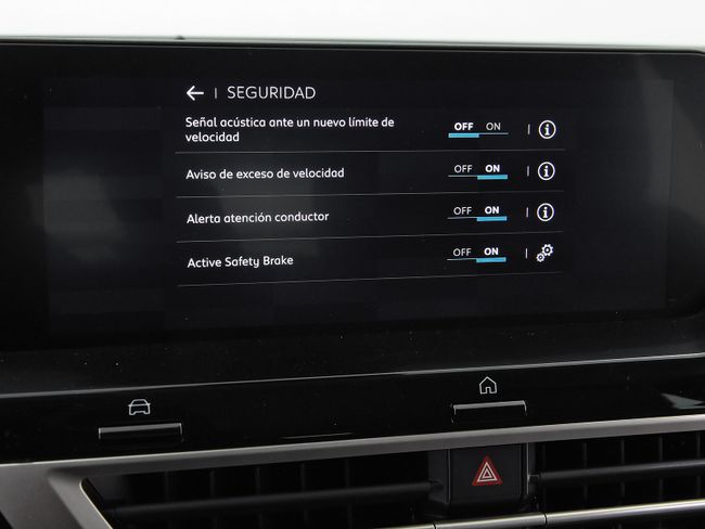 - Sistema de alarma de colisión: activa las luces de freno con asistencia de frenado, sistema antiatropello peatones/ciclistas, monitorización del conductor y frenado a baja velocidad de 30 Km/h como mínimo aviso visual/ acústico, distancia programable y funciona por debajo de 50 km/h / 30 mph